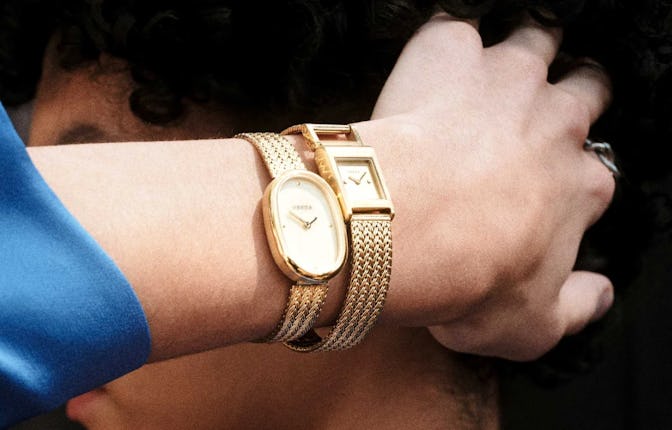 The Revel’s woven mesh band has a dainty, almost fish scale-like quality that’s perfectly contrasted by the watch’s straight lines. Measuring at 14 millimeters, the band seamlessly blends with the rectangular face, the 3ATM splash-resistant silhouette plated with 18-karat yellow gold — a splurge-worthy piece that’ll see you through changing fashions and years of wear.