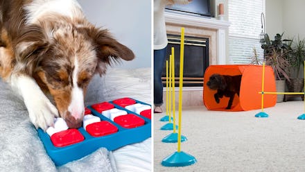This dog-training kit consists of poles made from super lightweight materials and a collapsible tunnel, so you can easily tuck it in a closet between training sessions. When it is time to practice this agility-boosting course, it only takes a few minutes to pop up the tunnel, set up the jump, and line up the weave poles, so your dog can get his zoomies out.