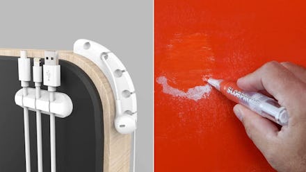 Solution: These holders that wrangle your cordsHold pesky wires and cables in place with these cable clips, which come with two in a pack. Each clip can hold up to five wires. The clips have a 3M self-adhesive backing that sticks to surfaces like desks and tables and you can choose from white, black, or multicolored options.