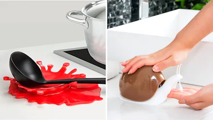Keep countertops clean and bring a playful touch to your kitchen with this hilarious ketchup spill spoon rest. It’s made of bright red silicone and is conveniently dishwasher-safe for hassle-free post-dinner cleanup. It measures 7.6 inches by 6 inches to accommodate standard cooking utensils such as a ladle, and has a flat base and raised sides for stability and to contain excess liquids.