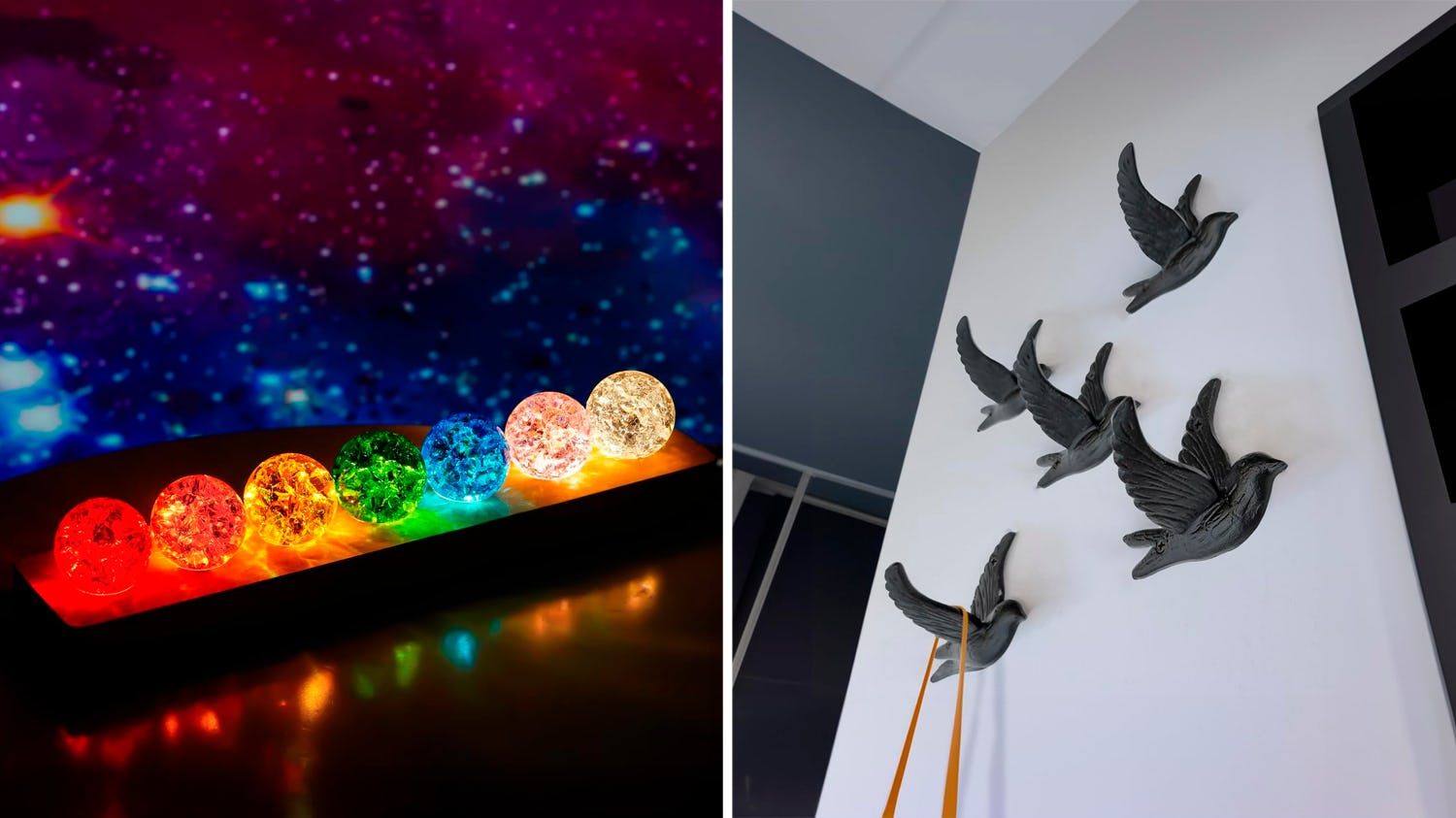 This dreamy crystal ball set instantly adds a little magic to any space. You get seven crackled glass spheres in vibrant chakra-inspired colors, all glowing beautifully on a sleek wooden base. Once plugged in with the included USB cable, they sparkle like magical orbs on your shelf.