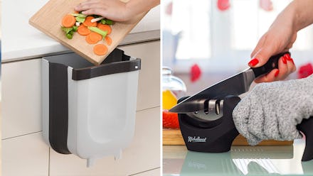 Solution: A tiny trash can that hangs under your counterIf you've ever dropped kitchen scraps on the way to the trash can (who hasn't), grab this tiny trash can that hangs directly under your counter. It clips onto a kitchen drawer or cabinet door, and the design keeps your trash bag secure. Chop your veggies and simply slide peels into this fully collapsible trash can that will lay flat against your cabinet.