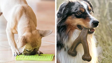 It’s normal to watch your dog happily chewing on a bone or toy, but when they transfer their chewing skills to your brand new couch and all of its pillows, it’s time to find a tool that will redirect their chewing. “Chewing is a natural behavior for dogs, but it can become a problem when they start chewing on things they're not supposed to, like furniture or shoes,” Li-ran Bukovza, dog expert at Puppy Tip, tells Bustle. “If your dog is a chewer, again, the best way to stop the behavior is to provide him with plenty of appropriate chew toys." Try this extremely durable wishbone for dogs that comes in three flavors: bacon, chicken, and peanut.